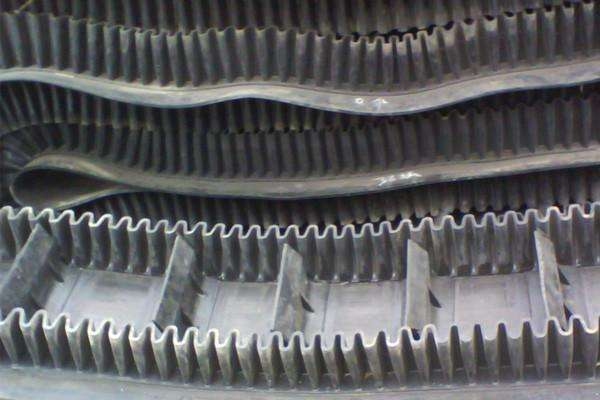 大倾角波状挡边带由基带、挡边、横隔板3部分组成。挡边起防止物料测滑撒落的作用。为便于绕过滚筒,档边设计成波纹状;横隔板的作用是承托物料,为了实现大倾角输送,采用T型TC型。档边和横隔板是用二次硫化的方法与基带连接的,具有很高的连接强度。